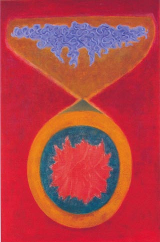 The Ageless Wisdom teaches that we live in a spiritual, electrical universe. The sun is threefold in nature, relating distinct energies, or fires. The outer, physical sun radiates fire by friction. This essentially cold fire produces heat due to friction with the earth's atmosphere. The second aspect of the sun radiates that fire which flows through every atom in our system, uniting and holding together in equalibrium the structure of our universe. This is Solar Fire, the energy we call Love. Both of these fires flow from Fire Electrical, which embodies the Will and Purpose aspect of Diety. In the painting, the blue fire at the top represents Fire Electrical from which the other fires emerge. The fiery red form below is Solar Fire, the energy of Love. (Painted in 1964) |