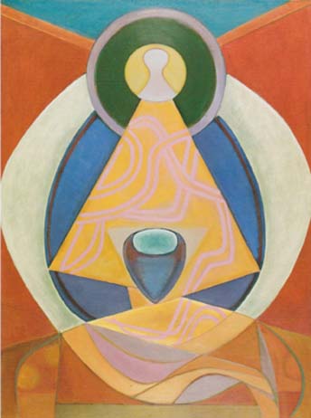 In Buddhism, the coming World Teacher is expected as Maitreya Buddha. A thangka is traditionally a Buddhist religious painting on cotton or silk, often depicting a Buddhist deity. It would commonly be used as a spiritual guide and inspiration for personal meditation and enlightenment. By contemplating the deity depicted the viewer can internalise the Teacher's qualities. Painted in 1965, Benjamin Creme's modern version of a thangka, in oil on board, has been described as depicting the "relationship between a Master and his disciple. The circles around the top of the head are about different levels of consciousness. The rose colored lines represent the cosmic energy of Love and the interconnectedness of the universe." (Share International magazine, November 2016) |